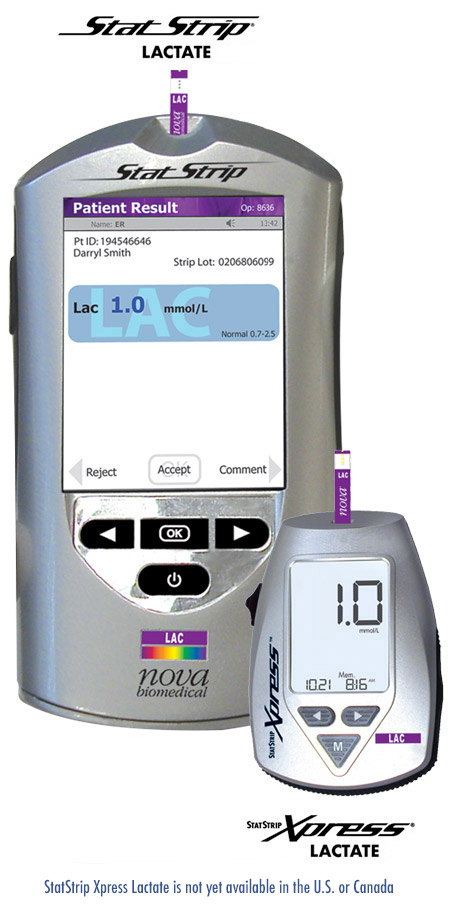 StatStrip Lactato es un sistema manual para lugares de atención que acerca la prueba de lactato al pie de la cama del paciente. Actualmente el lactato se mide en analizadores de gases en sangre, lo que crea numerosos problemas para realizar pruebas al pie de la cama. Los analizadores de gases en sangre requieren muestras arteriales anaeróbicas; volúmenes grandes de muestra (100-200 µL); y tiempos de análisis largos (hasta 2,5 minutos). Asimismo, los analizadores de gases en sangre son complejos para operar, están fijos en una ubicación y tanto su compra como la realización de pruebas son caros. StatStrip Lactato proporciona resultados en el tiempo más rápido posible (13 segundos), con la muestra de sangre completa más pequeña (0,6 µL), y los médicos y el personal de enfermería lo pueden utilizar con facilidad. StatStrip Lactato es un dispositivo de muy bajo costo que hace que la prueba de lactato sea práctica y económica en cualquier departamento de emergencias, unidad de cuidados intensivos o unidad médica de cualquier tamaño.